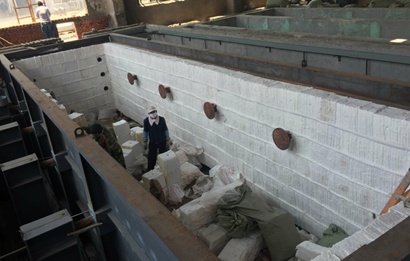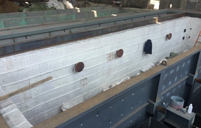 在鋅鍋火道外側(cè)做保溫,包括側(cè)墻和鋅鍋蓋板頂部兩部分??刹扇∠绕戒亙蓪?0mm厚的纖維毯(壓縮至50mm厚),再用250~300mm厚的標(biāo)準(zhǔn)陶瓷纖維模塊,總保溫厚度控制在300~350mm,采用兵列示排布方式。